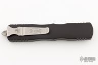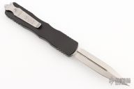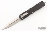 This Dirac Delta OTF automatic by Microtech features a D/E satin finish blade with a standard edge. The handle is black aluminum with stainless steel tip down clip. Serial number 4688 and dated 09/2021. Comes with original box and papers. Has some scuffs and scratches, and a couple dings in the frame. Has some light rusting on the blade, and in the ricasso. Great user condition.