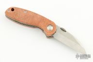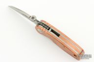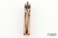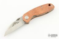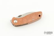 This Midnight June Bug SF by Emerson has been turned into a Po-Boy by Andrew Charlet. It has a zero ground blade with notched thumbrest and thumbdisc. The handle has custom hammered copper scales, titanium liners, copper backspacer. Nice detent, lockup and blade seating. Comes with original box, clip, hardware, micarta scales. Excellent condition. #0275