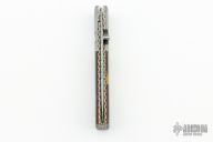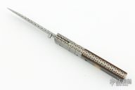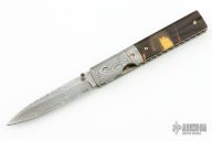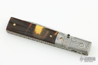 This linerlock by Mel Pardue has a Damascus blade with single thumb stud tortoise inlay, fileworked spine. The handle has dovetailed and fluted Damascus bolsters, fluted tortoise scales with gold plated screws, fileworked and anodized titanium liners, fileworked stainless steel backspacer. Nice detent, lockup and blade seating. Comes with a zippered case. Excellent condition.