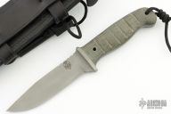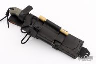 This Survival Knife by Ed Martin features a bead blast finished blade with notched thumbrest, .177" blade stock and 1.183" blade depth, full tang construction. The handle has a stainless steel guard, black canvas micarta scales. Comes with a black leather sheath with sharpening rod, firesteel and striker. Has a couple light scratches, otherwise excellent condition.