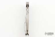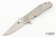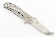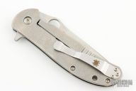 This C214TIP Advocate is a Gayle Bradley design executed by Spyderco. It features a satin finished drop point blade with thumbhole, notched thumb ramp and flipper. The handle has an orange peeled titanium frame over barrel spacers with a steel tip up clip that is reversible for right or left hand carry. Steel lock face insert and lanyard hole in pommel. Nice detent, lockup and blade seating. Rides on bearings. Excellent condition. Comes with original box and papers.