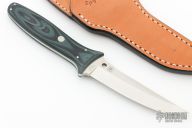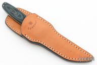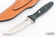 "It is only natural that Spyderco follow-up Bob Lum's folding tanto with a fixed blade, and a very classy one at that. It has a Hamaguri (appleseed) grind at the tip for added strength and the swedge on the spine lessens the overall weight. The blade has a tapered Tang, running the full length of the handle, adding overall strength. The expanded hand guard, where the blade and handle meet, makes it comfortable while gripping. Blade is hollow ground." The FB03 is a discontinued model no longer available from Spyderco. Includes original box, brown leather sheath and papers. Excellent condition.