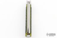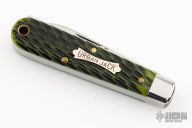 Handle: The teardrop shaped handle has stainless liners supporting securely pinned, Green Jigged bone covers for rugged visual appeal and traction in the hand. Brushed short stainless bolsters at the pivot are flush fit to the scales. Strong, full length stainless back springs, brass lanyard tube and pins complete the construction along with a wide, "Urban Jack" Bowtie shield round out construction.