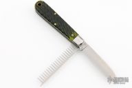 Blade: This utilitarian slip joint folding knife has two blades: a flat ground, satin finished 1095 carbon steel spear point and Beard Refuse Removal tool (a.k.a. a comb). The utilitarian spear blade handles a variety of daily cutting tasks with ease equipped with a spine swedge for a fine point for piercing and detail work. The BRR easily removes crumbs or other leavings from your facial hair regardless of style. Open via the nail nick or rounded end with snappy half stop operation for added safety. The spear blade has an "Urban Jack" etching in addition to the standard blade stamps.