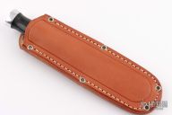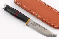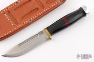 This knife by Bark River features a satin finished blade with false top edge and fullers, .144" blade stock and .948" blade depth, hidden tang construction. The handle has a brass guard and aluminum butt, black canvas micarta grip with black and "Bloody Basin" spacers. Comes with original brown leather sheath and box. Excellent condition.