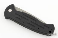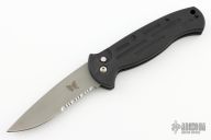 This Early AFO Automatic from Benchmade features a bead blasted drop point blade with swedge and partial serrations. The handle is comprised of black aluminum with a lanyard hole in pommel. Has a few light scuffs, otherwise excellent condition. Comes with original box, sheath and papers.