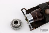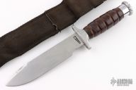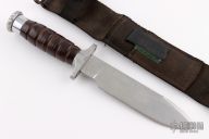 This Survival Knife by Garcia features a high satin finished spear point blade with sawteeth on the spine, .153" blade stock and 1.501" blade depth, hidden tang construction. The handle has an aluminum guard, stacked leather hollow handle and removable aluminum butt cap, has storage area in handle. Has a black nylon sheath. Has scratches, has been used and sharpened, otherwise good user condition.