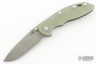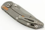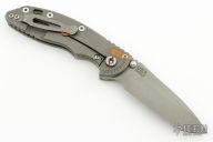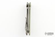 This XM-18 from Rick Hinderer features a spear point working finished blade with notched thumbrest and dual thumbstuds. The handle has a textured translucent green G-10 scale, working finished titanium frame, titanium barrel spacers, titanium hardware, titanium pocket clip. Copper filler tab and LBS. Dual thumb studs and notched thumbrest. Reversible pocket clip. Strong lock up, nice detent and blade seating is center. Comes in the original box and extra hardware, a custom black paper micarta scale, and original hardware. Has some scuffs, otherwise excellent condition.
