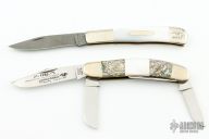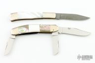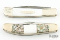 This Set by the American Blade Collectors Association is from 1986. It features two knives, this first is a 4 blade slipjoint with mirror polished blades, nickel silver double bolsters, abalone and mother of pearl covers, brass liners and stainless springs. Excellent condition. The other knife has a Damascus blade with nail nick. the handle has nickel silver double bolsters and escutcheon, mother of pearl covers, brass liners and a stainless spring. Has some light scratches, otherwise excellent condition. Both knives are numbered 0464 out of 3997. Comes with original case.