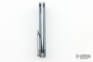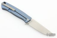This Arsen framelock flipper by KD Knives features a hand rub satin finished blade with a flipper. The handle has a tumbled and anodized titanium frame with a blasted and anodized titanium backspacer and tip up clip. Rides on bearings, nice detent, lockup and blade seating. Comes with original wooden box and COA dated 16-06-21. Excellent condition.
