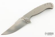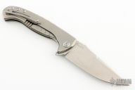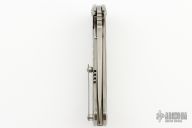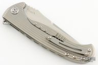 This Volcan Flipper from Kizer designed by Matt Diskin features a tumble finished clip point blade with swedge, notched thumb rest and flipper. The handle is comprised of a tumbled titanium frame over a matching titanium backspacer, reversible titanium tip up clip. Stainless steel lockface insert. Includes original box and zippered case. Excellent condition.