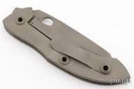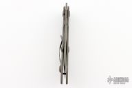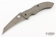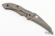 This Framelock by Warren Thomas features a bead blasted chisel ground blade with a carbidized edge. The handle has a bead blasted titanium frame with a matching tip up pocket clip. Has some scuffs, otherwise good condition.