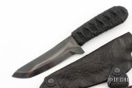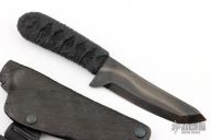 This Jashido by James Piorek of Blade Rigger Custom Knives features a black satin finish tanto style blade with hamon, .159" blade stock and 1.200" blade depth. The handle epoxy soaked cord wrap over hidden tang construction. Includes a Rigger coated kydex sheath with shoulder rig. Comes with zippered case. Excellent condition.