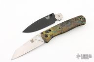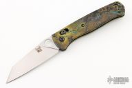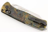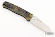 The Bugout features a satin finished Magnacut blade with thumbhole by Gersh Blades. Comes with original black S30V blade. Has custom "shipwreck" finished Flytanium brass scales and tip up stainless steel clip, titanium backspacer with GITD inlay. The scales were custom finished by Robert Durand. Comes with ultem scales, burlap micarta scales, original black FRN scales. Comes with original box and papers. Excellent condition.