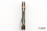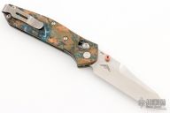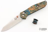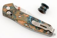 The Benchmade Osborne 945 is the same beloved Osborne design that has made the 940 a titan of the industry, but it's been shrunk down to a more comfortable size for everyday carry. The knife is made of CPM-S90V steel, and has a copper handle with stainless steel liners. Has a custom titanium backspacer, copper thumbstuds and a deep carry stainless steel pocket clip. It locks open with the proven, ambidextrous AXIS lock. Comes with original clip, thumbstuds and barrel spacers. Comes with original box and papers. Excellent condition. The scales have been given a "Shipwreck" finish by Robert Durand.