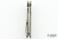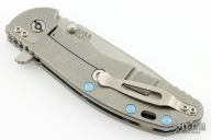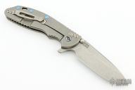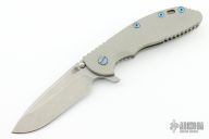 This XM-24 by Rick Hinderer features a stonewash finished blade with notched thumbrest and flipper. The handle has a stonewash finish titanium frame, gray G-10 scale, black titanium hardware, barrel spacers, and a tip up or down reversible titanium clip and filler tab, lanyard hole at the butt. Has some light scuffs on the hardware, otherwise excellent condition.