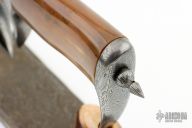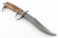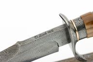 This Forged Sub-Hilt Bowie by Master Smith David Lisch features his Dragon Thunder Mosaic Damascus (1080 and 15n20) blade with sharpened top edge, .227" blade stock and 1.568" blade depth, hidden takedown tang construction. The handle has matching Damascus guard, spacer, sub-hilt and butt, walrus ivory grip, and a domed hammered gold spacer, Damascus tang nut. Comes with a custom forged steel stand with walrus ivory fittings. Comes with COA dated Jan 2020. Excellent condition.