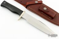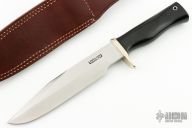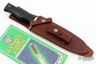 This Model 14 by Randall Made Knives features a satin finished blade with sharpened top edge and notched thumbrest, .203" blade stock. 1.450" blade depth, full tang construction. The handle has a nickel silver guard, black linen micarta handle with a lanyard hole at the butt. This knife was designed to meet the demand for an almost indestructible all-purpose knife, though it is especially suited for combat and survival purposes. Comes with brown leather sheath. Excellent condition.