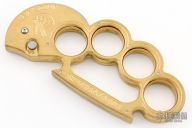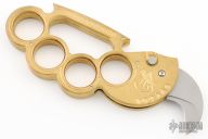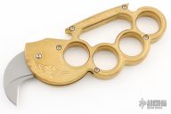 This BMF Interrogator by Rob Dalton is a set of brass knuckles with a small claw automatic blade on the thumb side. Bead blasted blade with 1" cutting edge. 1 1/16" diameter finger holes. Made of brass for that heavy duty feel. Perfect function. Says "Interrogator" on handle. Has a couple light scratches, otherwise excellent condition.