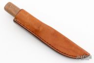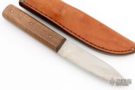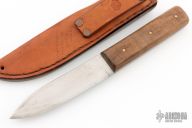 This knife by Wayne Goddard features a satin finish drop point blade, .099" blade stock and 1.096" blade depth, full tang construction. The handle is comprised of wood scales and brass pins. Includes leather sheath with belt loop. Has some light scratches, otherwise good condition.