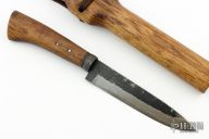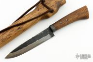 This knife features a San Mai Damascus blade, .200" blade stock and 1.209" blade depth, partial full tang construction. The handle has a hammered steel guard with a wooden handle. Comes with a wooden scabbard and original box. Has some light scuffs and patina, otherwise excellent condition.