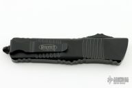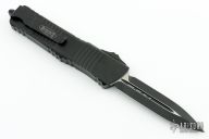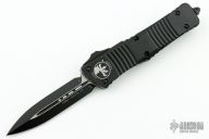This Combat Troodon OTF automatic by Microtech knives features a black double-edged double blade, and a black aluminum handle with black hardware, tip down carry. Glass breaker. S/N 36042. Dated 11/2021. Comes with original box and papers. Has a couple light scuffs, otherwise excellent condition.