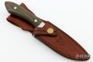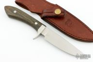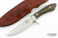 This Sendero Classic from White River Knife and Tool features a tumble finished blade with notched thumbrest, .126" blade stock and 1.080" blade depth, hidden tang construction. The handle has a stainless steel guard and green canvas micarta grip. Numbered #938 on the ricasso. Includes a brown leather sheath. Has a couple light scuffs, otherwise excellent condition.