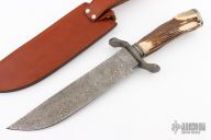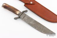 This Bowie features a Damascus blade with fileworked spine, .198" blade stock and 1.967" blade depth, hidden tang construction. The handle is comprised of a Damascus guard, stag grip and a Damascus pommel. Includes a brown leather sheath. Has a few light scuffs, otherwise excellent condition.  Comes with a zippered case.