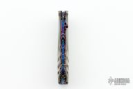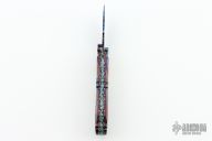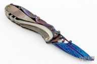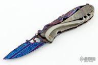 This knife by Suchat Jangtanong features a carved hot blued Damascus blade with a single diamond inlaid thumbstud. The handle has carved steel, hot blued Damascus and black lip pearl scales with fileworked and anodized titanium liners and a carved and anodized titanium backspacer with 2 diamond inlays, gold plated screws. Comes with zippered case. Nice lockup and blade seating. Excellent condition.