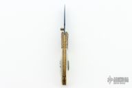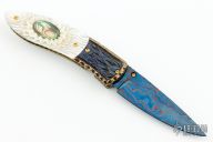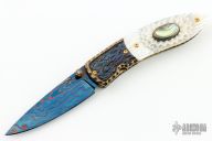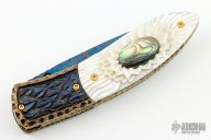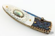 This knife by Suchat Jangtanong features a hot blued Damascus blade with a single diamond inlaid thumbstud. The handle has carved steel bolsters, carved mother of pearl scales with abalone inlays, fileworked and anodized titanium liners and backspacer, gold plated screws. Comes with zippered case. Nice lockup and blade seating. Excellent condition.