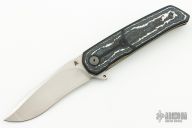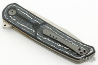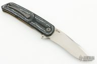 This A7 flipper by Andre Thorburn and Andre van Heerden features a hand rub satin finished Harpoon blade with swedge, notched thumbrest and flipper. The handle has White Storm fat carbon inlays framed with black G-10 scales, anodized titanium liners, black G-10 backspacer, Zirconium pivot and tip up clip. Rides on ceramic IKBS. Includes velcro case and COA dated March 2022. Great blade seating, detent and lock up with a very smooth and fast flipping action. Has a couple light scuffs on the clip, otherwise excellent condition.