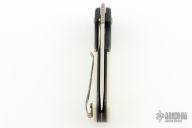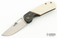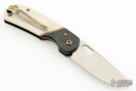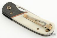 This Linerlock Front Flipper from Walter Wells of Wells Blade Works features a satin finished blade with notched front flipper. The handle has marble carbon fiber bolsters with integral liners, ivory G-10 scales with copper band inlays, inlaid/nested titanium liner. Bronze anodized stainless tip down clip and hardware. The backspacer is comprised of laminiated black G10 and copper. Some scuffs on the clip, otherwise excellent condition. Coems with COA dated 7/21/23