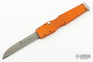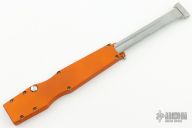 This Ranger Para-Rescue has a bead blast finished chisel ground fully serrated blade. The handle has an orange anodized aluminum frame with charging handle. Has some scuffs and scratches, great condition otherwise.