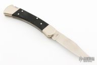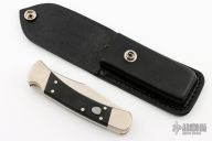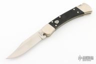 This Buck 110 Auto features a satin finished clip point blade. The handle has a nickel silver frame with black G-10 scales. Comes with a black leather sheath and original box. Excellent condition.