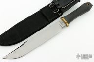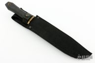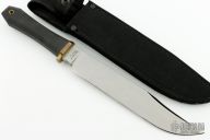 This Australian Bowie by Gerber features a bead blasted clip point blade with a false top edge, .293" blade stock and 1.487" blade depth, hidden tang construction. The handle has a brass guard and rubber handle with lanyard hole. Includes nylon sheath. If the guard has been modified, it has been done very well. Has some patina otherwise excellent condition.