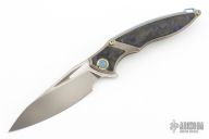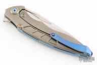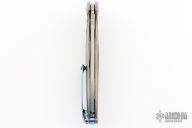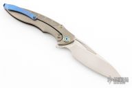 This RK1902 Flipper by Rike Knife features a two tone finish satin/blasted drop point blade with swedge, notched thumb rest and flipper. The handle is comprised of machined and bead blasted titanium frame with matching tip up clip. Blue carbon fiber inlays. Stainless steel lock face insert. Lanyard bale in backspacer. #201. Excellent condition. Includes box, padded and zippered case.