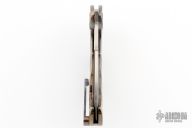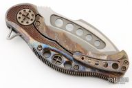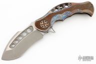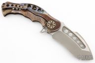 This Battle Master Flipper (BMF) by Curtiss Knives features a two tone blasted Magnacut compound ground recurve blade with notched thumbrest and flipper. The handle has an apocalyptic Mill titanium frame with matching backspacer and tip up clip. Titanium hardware. Rides on bearings with the spot pivot system. Nice detent, lockup and blade seating. Comes with COA dated 12-3-19 and zippered case. Has some marks on the blade otherwise excellent condition.