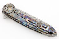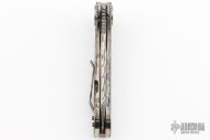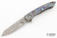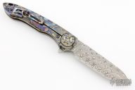 This frame lock flipper by Curtiss Knives features a Damasteel drop point blade with a notched thumbrest and flipper. The handle is composed of an anodized titanium frame complemented by a matching titanium tip up clip. Includes a padded zippered case. Has a couple light scuffs, otherwise excellent condition.