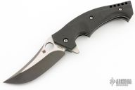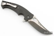 This Mamba flipper is a Walter Brend and Joel Pirela design executed by Spyderco. It features a two tone blade with satin finish flats and black grinds. Notches on blade spine and spine of handle. Carbon Fiber scales, bead blasted titanium liners, black G-10 backspacer, and a tip up stainless steel clip. Smooth function with a nice lock, detent and blade seating dead center. Hidden lanyard pin at the butt. Comes with a padded and zippered case. Has a spot on the blade. Excellent condition otherwise.