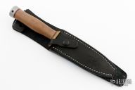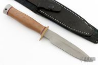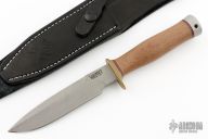 This Tunnel Rat by Vehement Knives features a bead blast and tumble finished blade with false top edge, .215" blade stock and 1.137" blade depth, hidden tang construction. The handle has a brass guard and aluminum butt, canvas micarta grip with black and red spacers. Comes with original brown leather sheath and box. Has some light scuffs and scratches otherwise excellent condition.