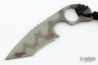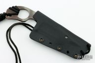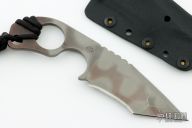 This SLCC by Mick Strider features a tiger striped multi-ground blade with a notched thumbrest, .187" blade stock and 1.491" blade depth. The handle has a finger groove and ring. Comes with a kydex sheath. Has some light scuffs, otherwise excellent condition.