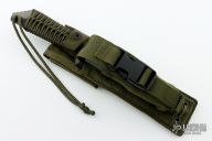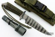 This Fighter by Strider features a tiger striped blade with sharpened top edge and notched thumbrest, .254" blade stock and 1.599" blade depth, full tang construction with a green paracord wrapped handle. Comes with a nylon sheath that holds a Millennium Series M2 Centurion flashlight. Has a couple of light scratches, otherwise excellent condition. #0353