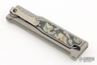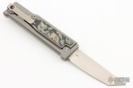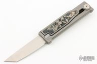 EXO Mini Gravity knife. Tanto blade, titanium handle, burl micarta inlays. Comes with original box, and accessories. S/N 469 dated 06/2023. Includes the original box and papers. Excellent Condition.