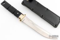 This Model 4004 Shugoto 1 by Al Mar features a satin finished upswept blade with sharpened top edge, .195" blade stock and 1.123" blade depth, hidden tang construction. The handle has a brass guard, black checkered FRN grip, lanyard hole at the butt. Comes with black leather sheath. Excellent condition. Very hard to find. #006/200