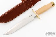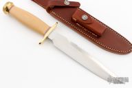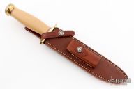 "The Model 1 was made famous by Allied combat troops in World War II and has since been widely used in all theaters of war." .217" blade stock and 1.307" blade depth, hidden tang construction. Has a satin finished blade with a sharpened top edge and sawteeth. Brass guard, ivory paper micarta grip with scalloped brass butt, red/white/blue spacers. Includes brown leather sheath. Excellent condition.