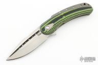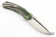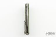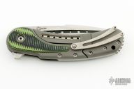 This Bodega flipper by Todd Begg Knives features a satin finished blade with a false top edge. Bead blasted titanium frame with green/black g10 inlays with cracked ice finish titanium backspacer, tip up pocket clip and pivot collar. Includes IKBS (Ikoma-Korth Bearing System) for smooth and fast opening that requires no wrist action. Outstanding work. Comes with a zipper case. Has some scuffs on the frame, otherwise excellent condition.