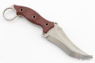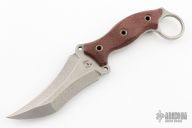This Triceratops by the Busse features a stonewashed blade with sharpened top edge, .201" blade stock, 1.771" blade depth, full tang construction with maroon canvas micarta scales and a lanyard hole. Excellent condition.