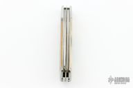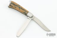 This Two-Blade Trapper by Bill Ruple features hand rub satin finished blades with nail nicks. The handle has satin finished stainless steel bolsters, mammoth ivory covers, fileworked stainless steel liners and stainless steel springs. Half stop blade positioning on both blades, flush in all positions. Comes with a zippered case. Excellent Condition.