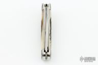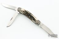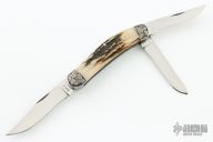 This Three-Blade Sowbelly Whittler by Bill Ruple features hand rub satin finished blades with nail nicks. The handle has engraved stainless steel dovetailed bolsters with 24k gold inlays, stag covers, polished stainless steel liners and springs. Half stop blade positioning on both blades, flush in all positions. Comes with a zippered case. Excellent Condition. A97 on the blade