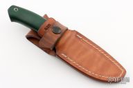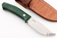 This knife by Marcus Lin features a satin finished hollow ground drop point blade with a full tang construction. .197" Blade Stock. 1.072" Blade Depth. The handle has a green micarta grip. Includes a brown leather sheath. New from maker!